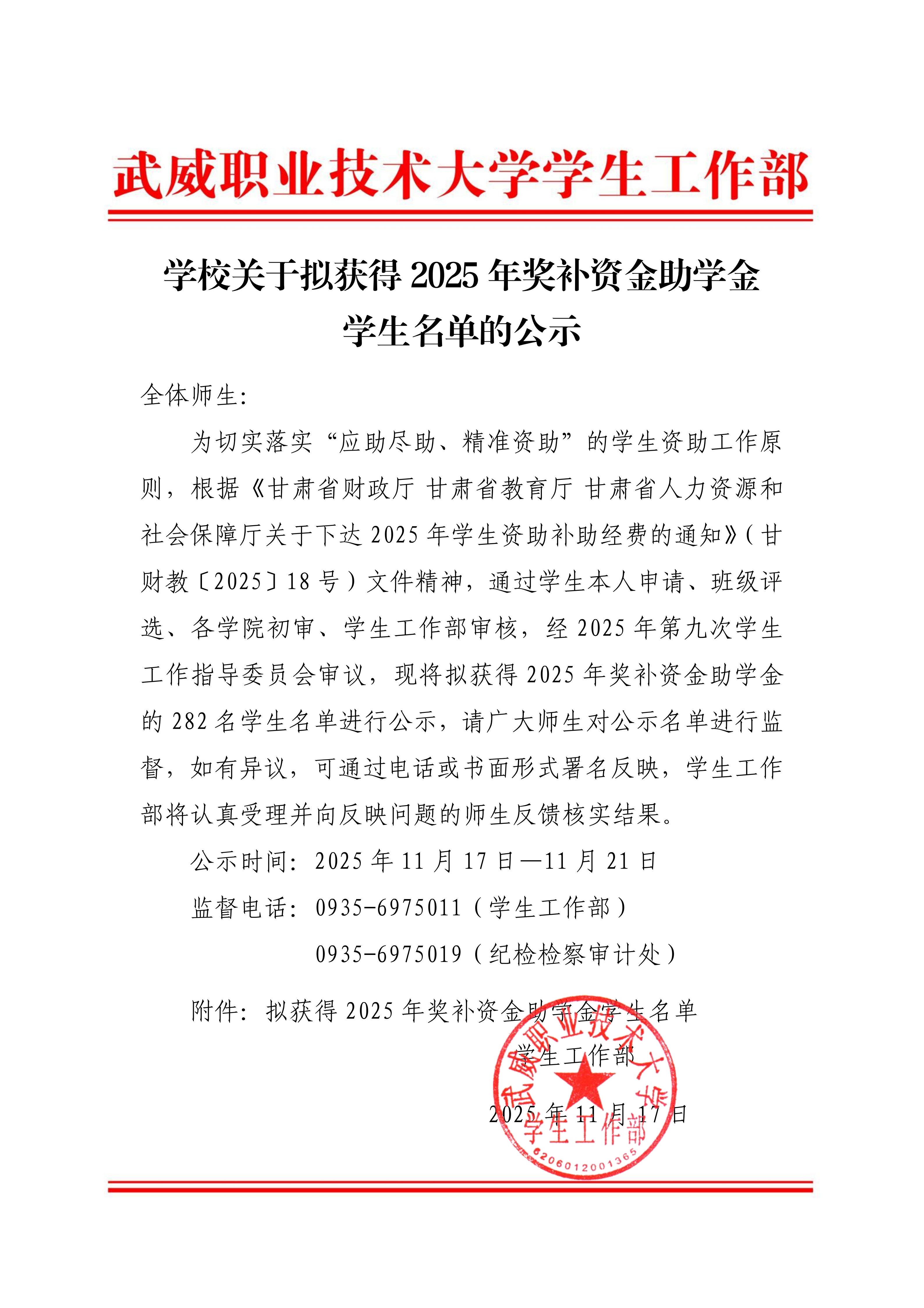 學(xué)校關(guān)于擬獲得2025年獎(jiǎng)補(bǔ)資金助學(xué)金學(xué)生名單的公示