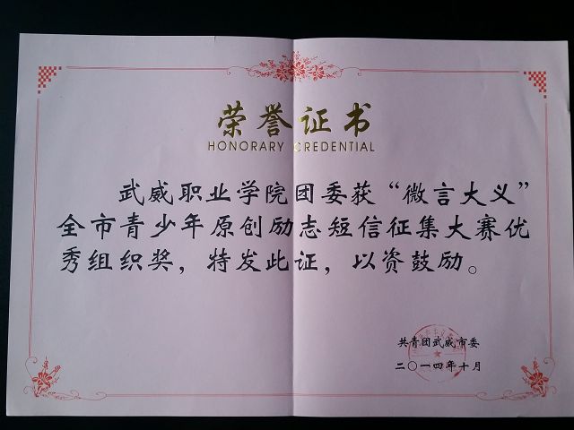 院團委在武威市“微言大義”青少年原創(chuàng)勵志短信征集大賽中獲獎