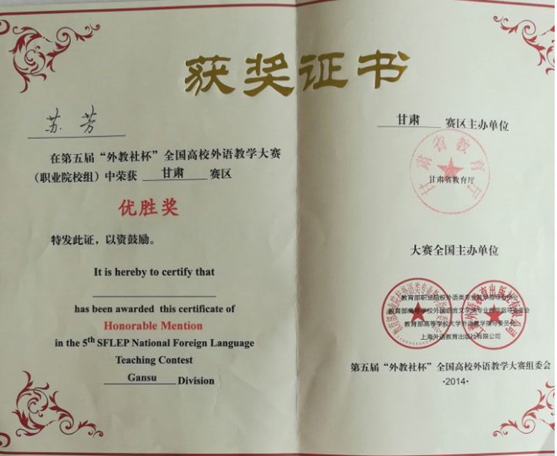 蘇芳榮獲2014年第五屆“外教社”杯全國(guó)高校外語教學(xué)大賽(職業(yè)院校組)甘肅賽區(qū)優(yōu)勝獎(jiǎng)