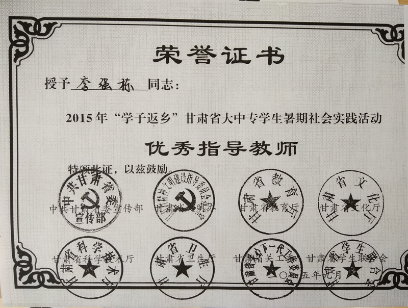 李強(qiáng)棟榮獲2015年“學(xué)子返鄉(xiāng)”甘肅省大中專(zhuān)學(xué)生暑期社會(huì)實(shí)踐活動(dòng)優(yōu)秀指導(dǎo)教師