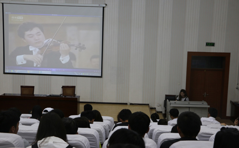 伴著優(yōu)美的音樂旋律王敏副教授開始了講座,王老師首先介紹了音樂發(fā)展歷史和音樂鑒賞的基礎(chǔ)知識(shí),然后以我國(guó)著名作曲家陳鋼、何占豪先生創(chuàng)作的小提琴協(xié)奏曲《梁山伯與祝英臺(tái)》為題材,分階段講述了“鳥語花香”、“草橋結(jié)拜”、“英臺(tái)抗婚”、“投墳化蝶”等內(nèi)容和藝術(shù)場(chǎng)景。剖析了作品在管樂、和以小提琴、大提琴為主的弦樂及民樂有機(jī)結(jié)合的高超藝術(shù)境界,講座過程中王老師結(jié)合《梁?!穮f(xié)奏曲音視頻資料,演繹了梁山伯與祝英臺(tái)凄美的愛情故事。