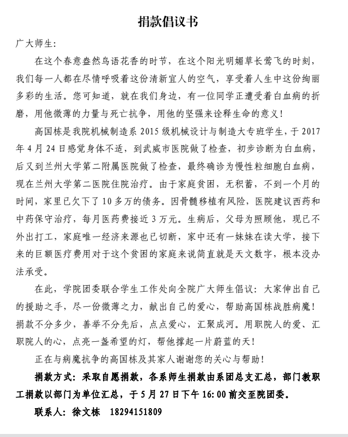藥學(xué)系為高國(guó)棟同學(xué)捐款公示