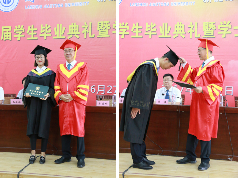 蘭交大教務(wù)處副處長王海涌宣讀了關(guān)于授予學(xué)士學(xué)位的決定;學(xué)生處處長貢力宣讀了關(guān)于表彰2016屆優(yōu)秀畢業(yè)生的決定;校黨委副書記、常務(wù)副校長李引珍為2017屆畢業(yè)生代表正冠撥穗并頒發(fā)學(xué)位證書;各位領(lǐng)導(dǎo)為畢業(yè)生頒發(fā)了畢業(yè)證書和優(yōu)秀畢業(yè)生榮譽(yù)證書。