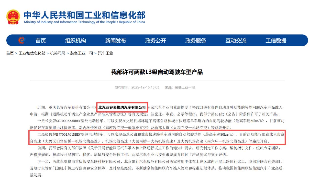 12月15日,北汽集团旗下极狐阿尔法S(L3版)正式获批工业和信息化部自动驾驶车型产品准入许可,即将在北京市限定区域内开展L3级有条件自动驾驶上路通行试点。这标志着我国自动驾驶技术发展逐步走向量产应用阶段,也是北汽集团在自动驾驶领域从技术验证阶段迈向量产应用阶段的重要里程碑。