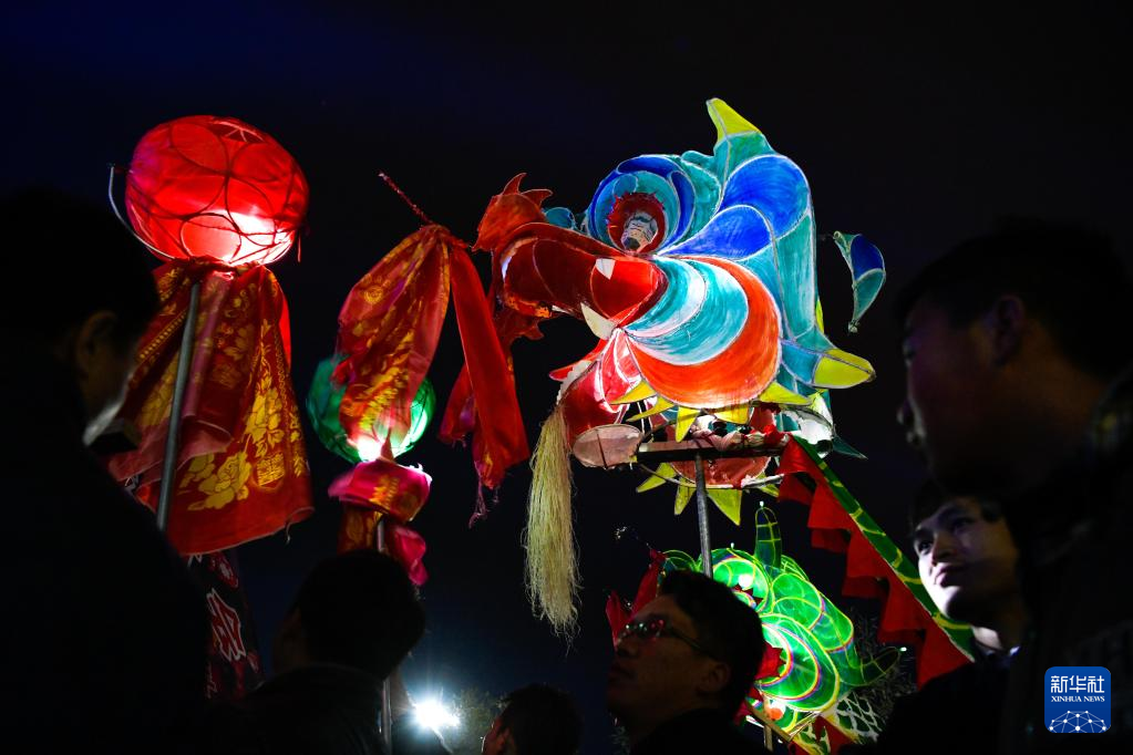 2月4日晚,在台江县,人们在参加苗族“舞龙嘘花”活动时拿着花灯等待入场。