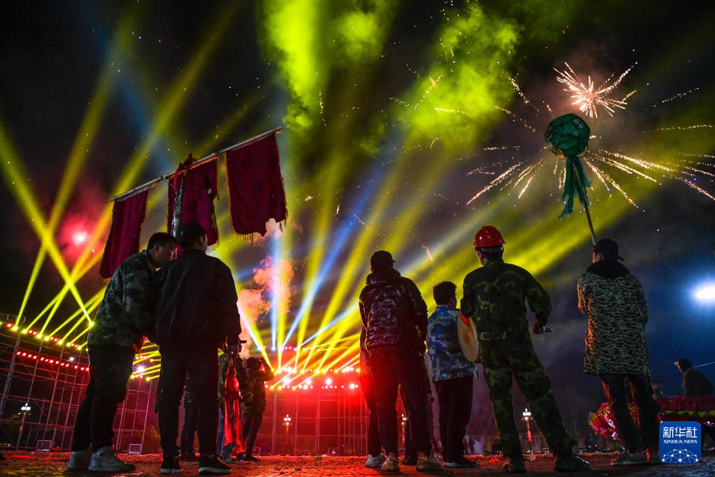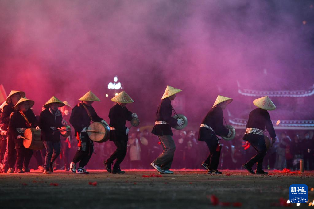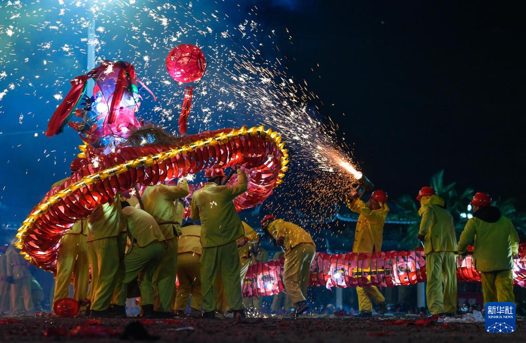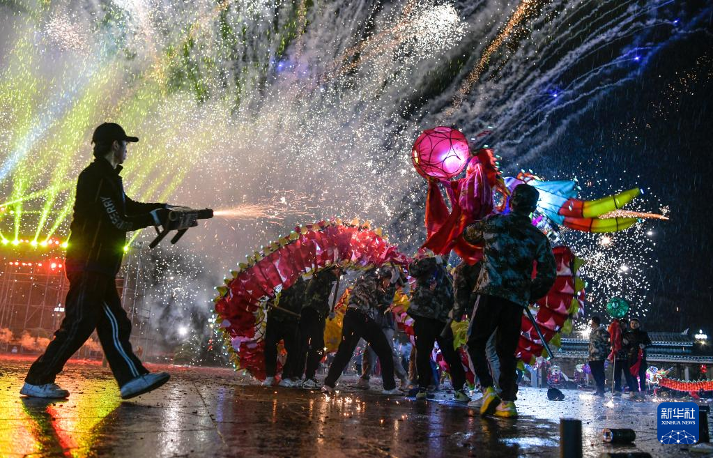 2月4日晚,人们在台江县参加苗族“舞龙嘘花”活动。