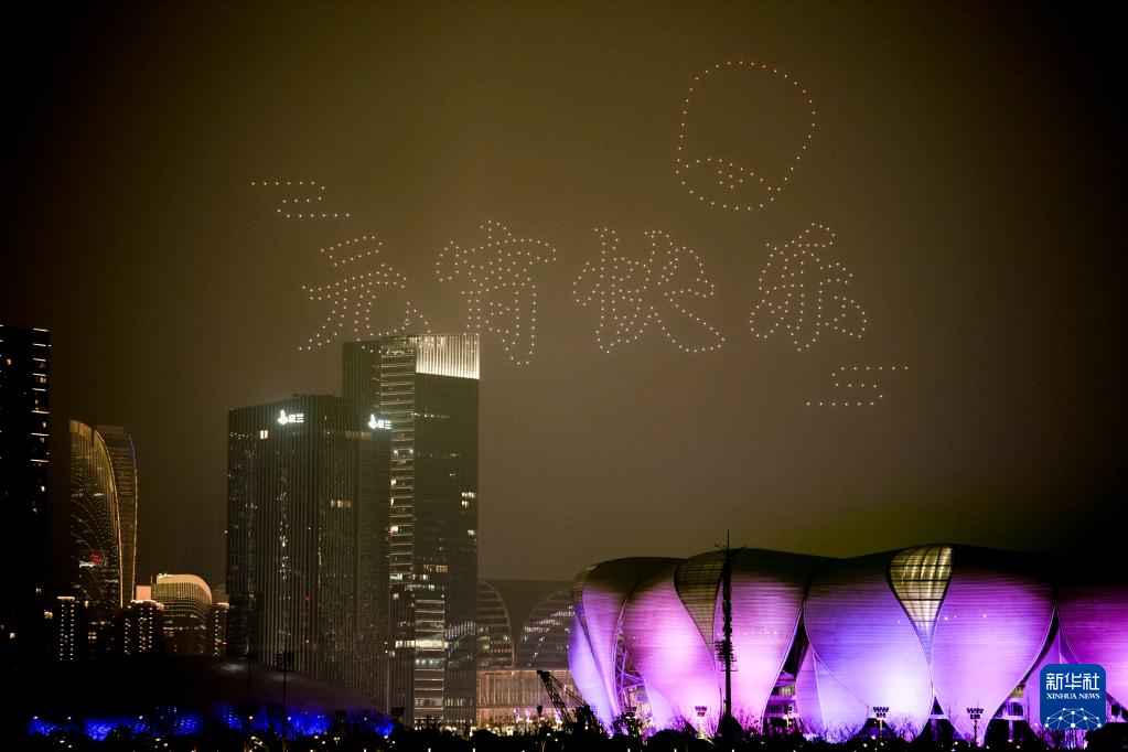 2月5日,无人机群在钱塘江畔的“迎亚运、庆元宵”烟花灯光秀表演中呈现“元宵快乐”字样。