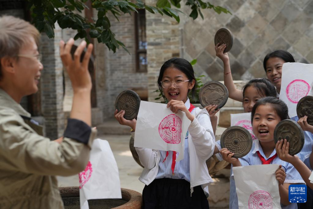 5月18日,小学生在河北省石家庄市新华区一家清代建筑博物馆体验瓦当拓片。