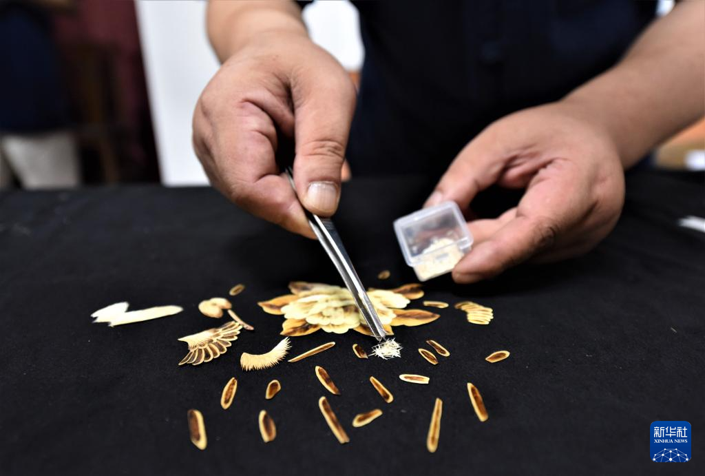 7月12日,吴永龙将麦秆画“零件”摆放在桌面上。