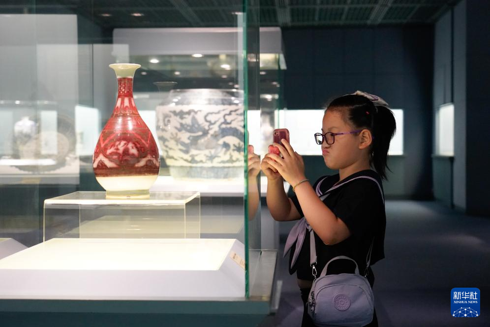7月14日晚,参观者在上海博物馆的中国古代陶瓷馆观看展品。