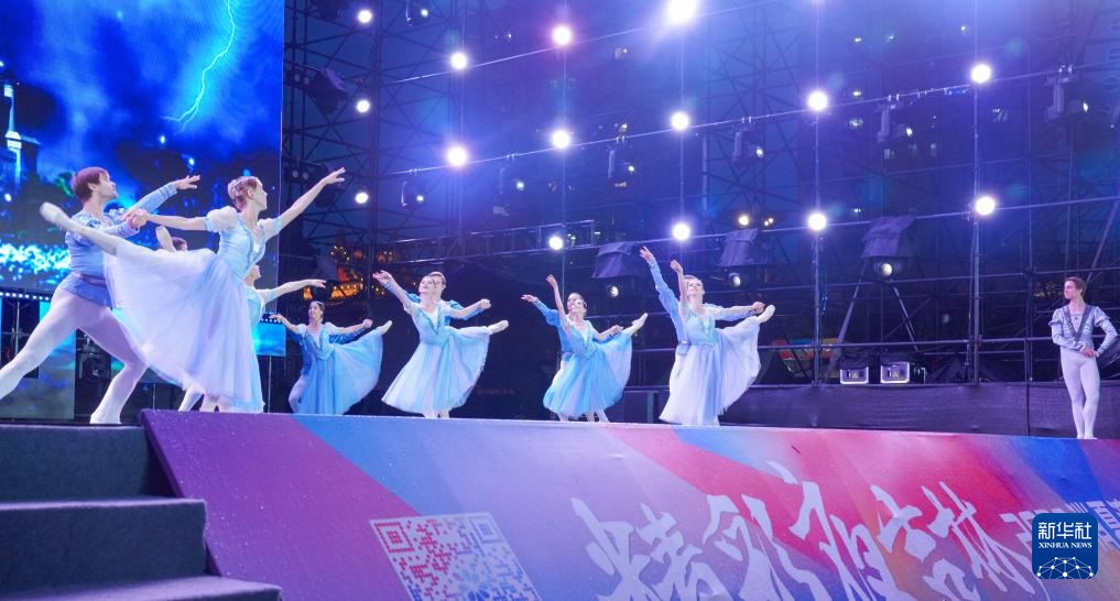 这是7月14日在长春文庙广场拍摄的俄罗斯马里埃尔国家模范歌剧舞剧院芭蕾舞剧《天鹅湖》演出现场。