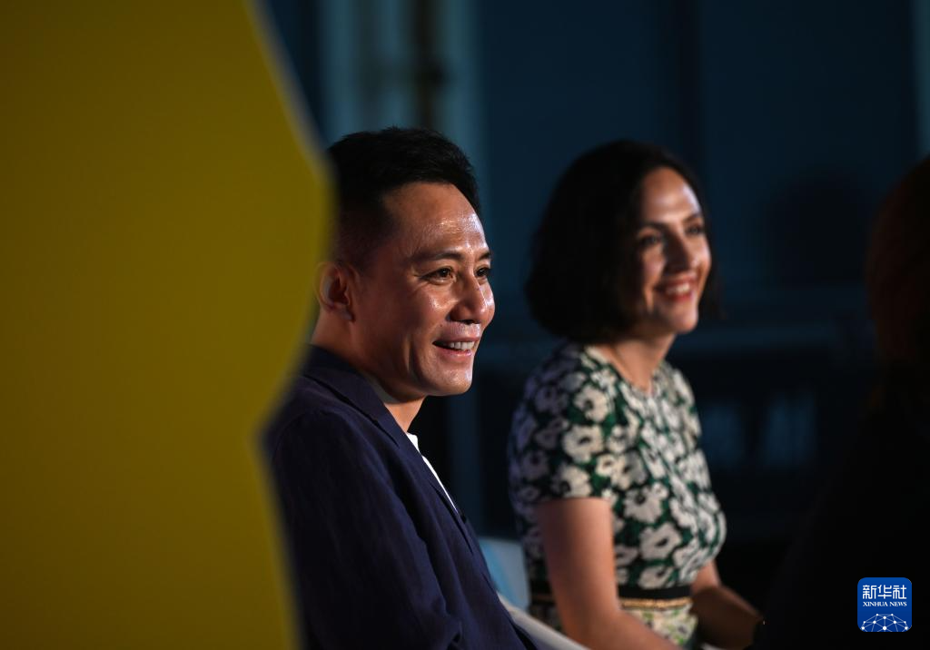 7月25日,话剧《悲惨世界》主演刘烨(左)、制作人安娜伊思·马田出席发布会。