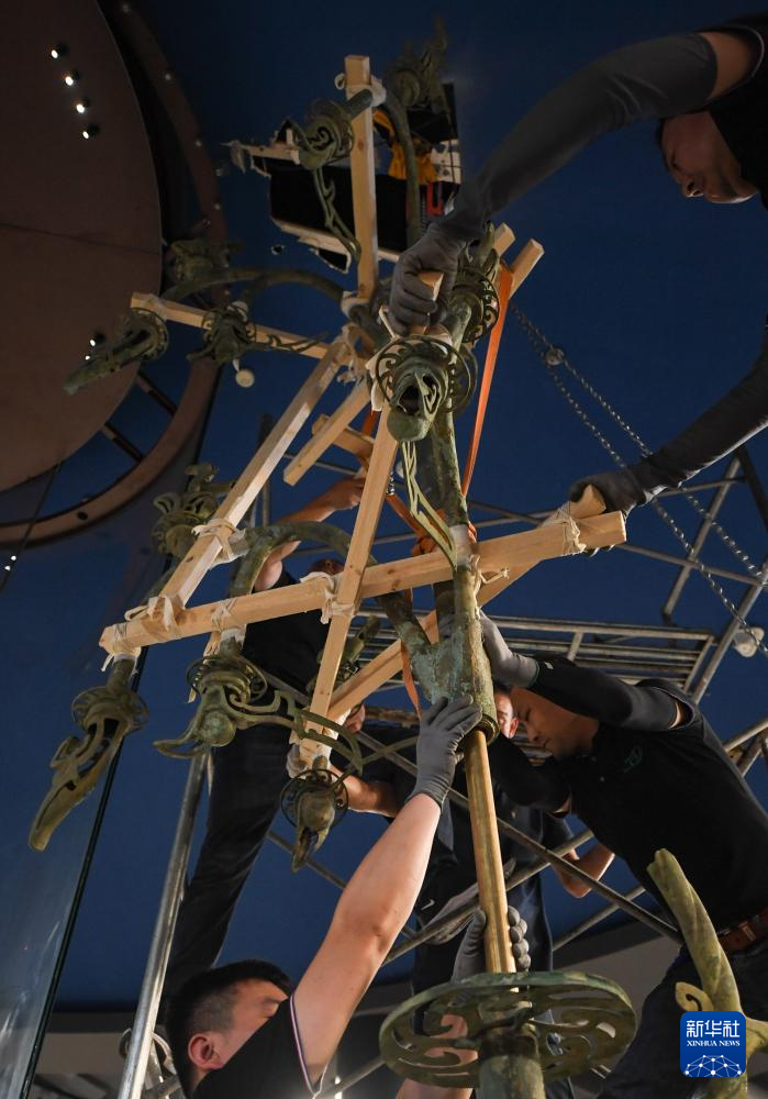在三星堆博物馆老馆,工作人员站上作业梯准备搬迁Ⅰ号大型铜神树(7月16日摄)。