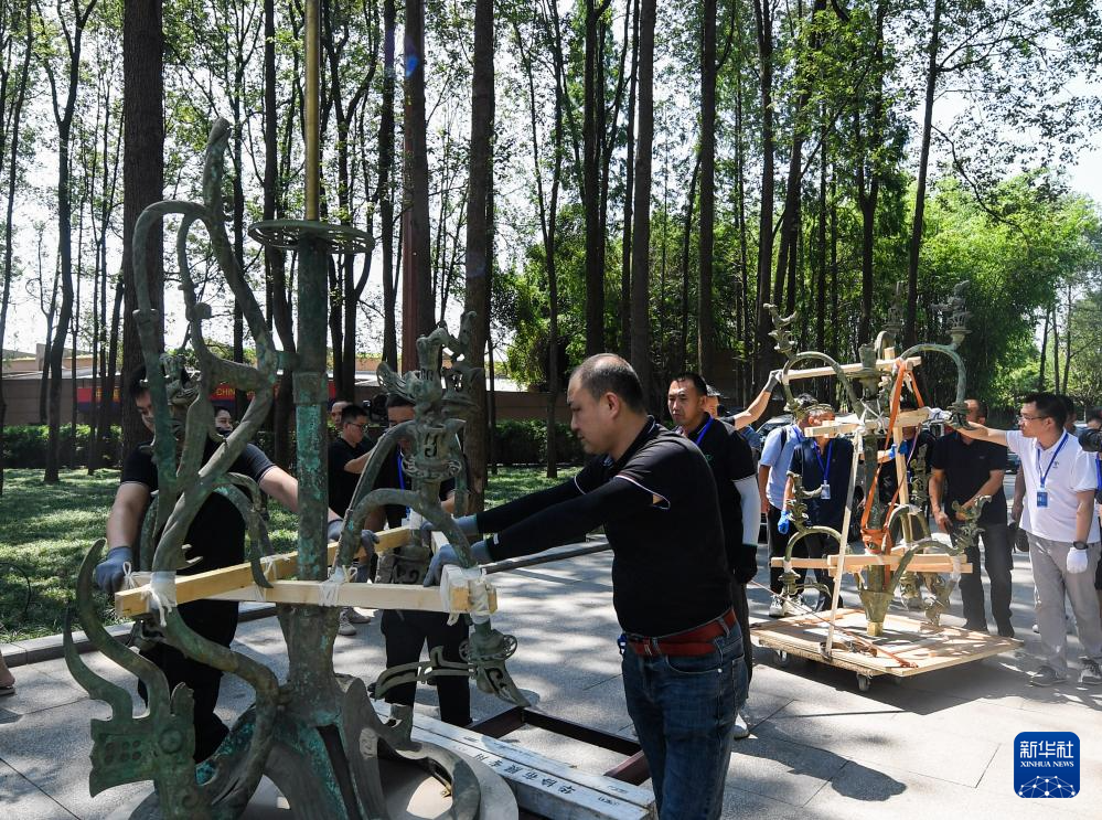 在三星堆博物馆,工作人员将Ⅰ号大型铜神树运往新馆(7月17日摄)。