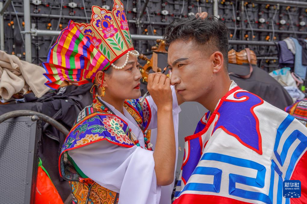 堆谐表演前,格桑卓玛在后台整理妆容(8月4日摄)。
