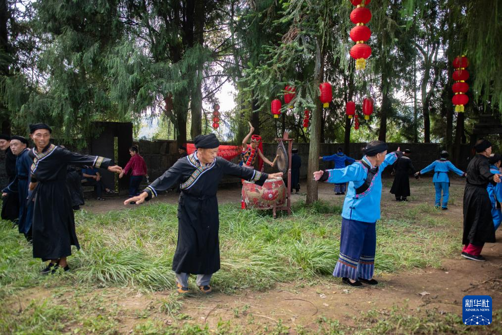 8月18日,舍米湖村村民在有着数百年历史的“摆手堂”前跳起摆手舞。