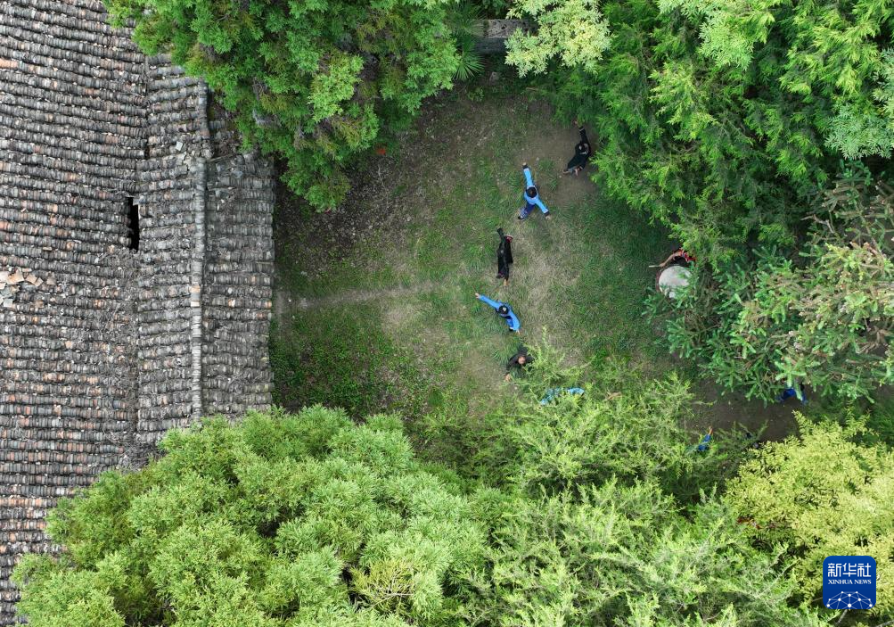 8月18日,舍米湖村村民在有着数百年历史的“摆手堂”前跳起摆手舞(无人机照片)。