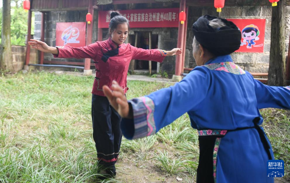 舍米湖村村民黎梅围(左)跟着老人练习摆手舞(8月18日摄)。