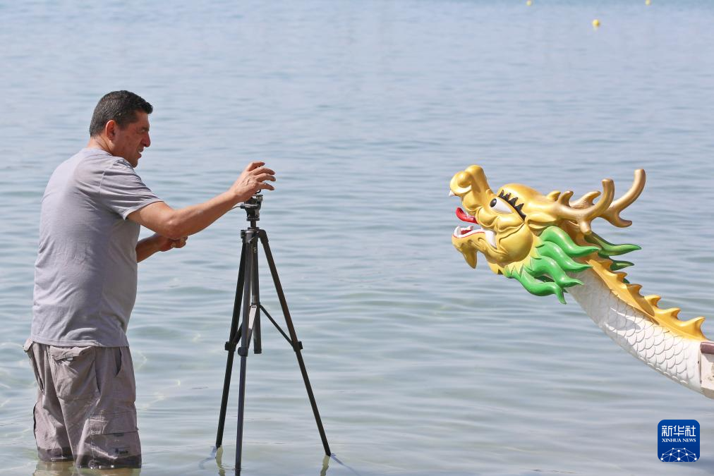 9月8日,一名摄影师在以色列阿卡给龙舟拍照。新华社记者 王卓伦 摄