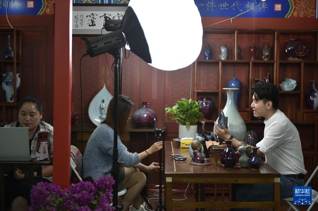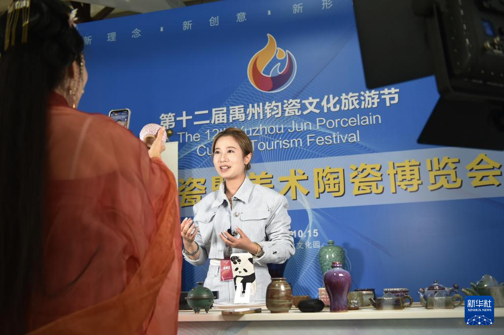 9月25日,工作人员在禹州市神垕钧瓷工业文化园内举办的中国钧瓷暨美术陶瓷博览会现场进行直播,推介钧瓷产品。
