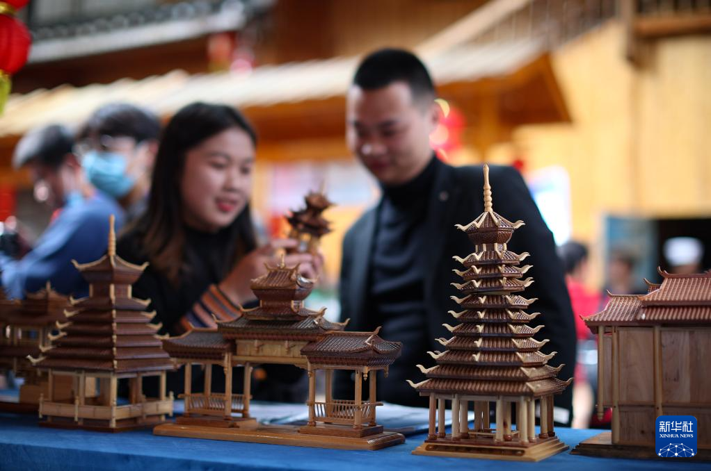 12月15日,在贵州省黎平县肇兴侗寨,侗族群众在侗年年货集市销售文创产品。