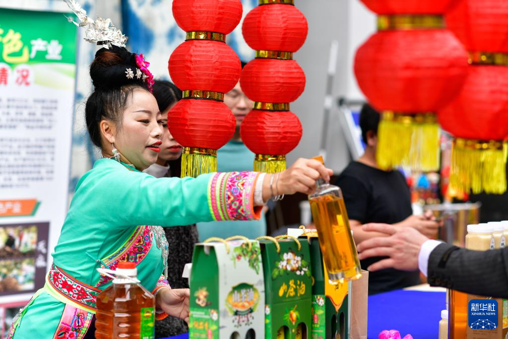 12月15日,在贵州省黎平县肇兴侗寨,侗族群众在侗年年货集市销售地方特产。