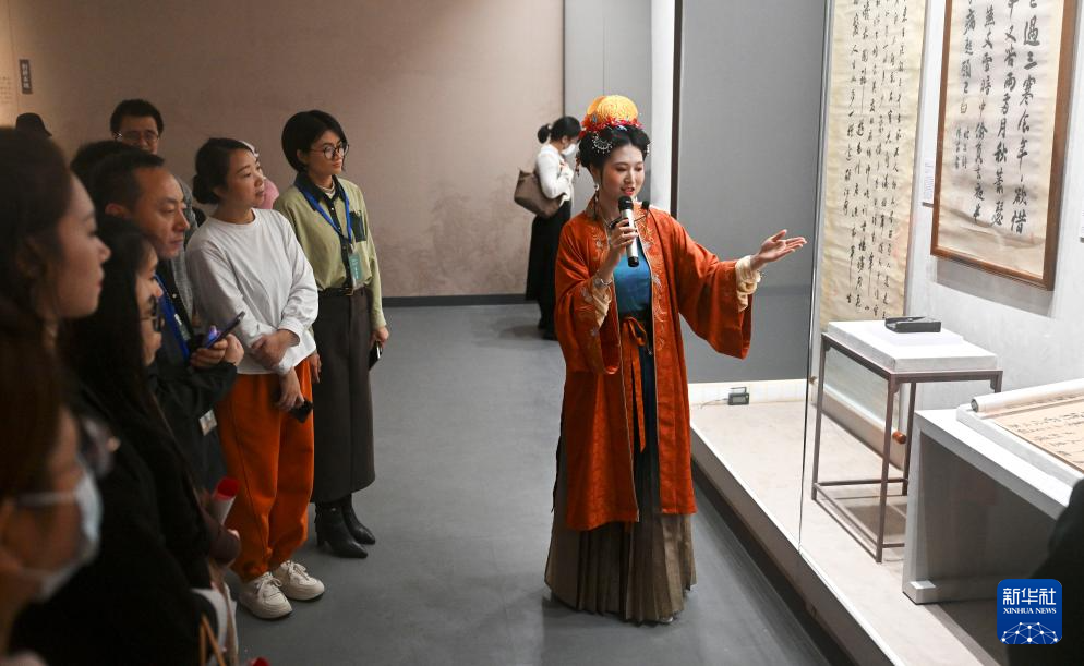 1月31日,身着古装的讲解员在向观众介绍展品。