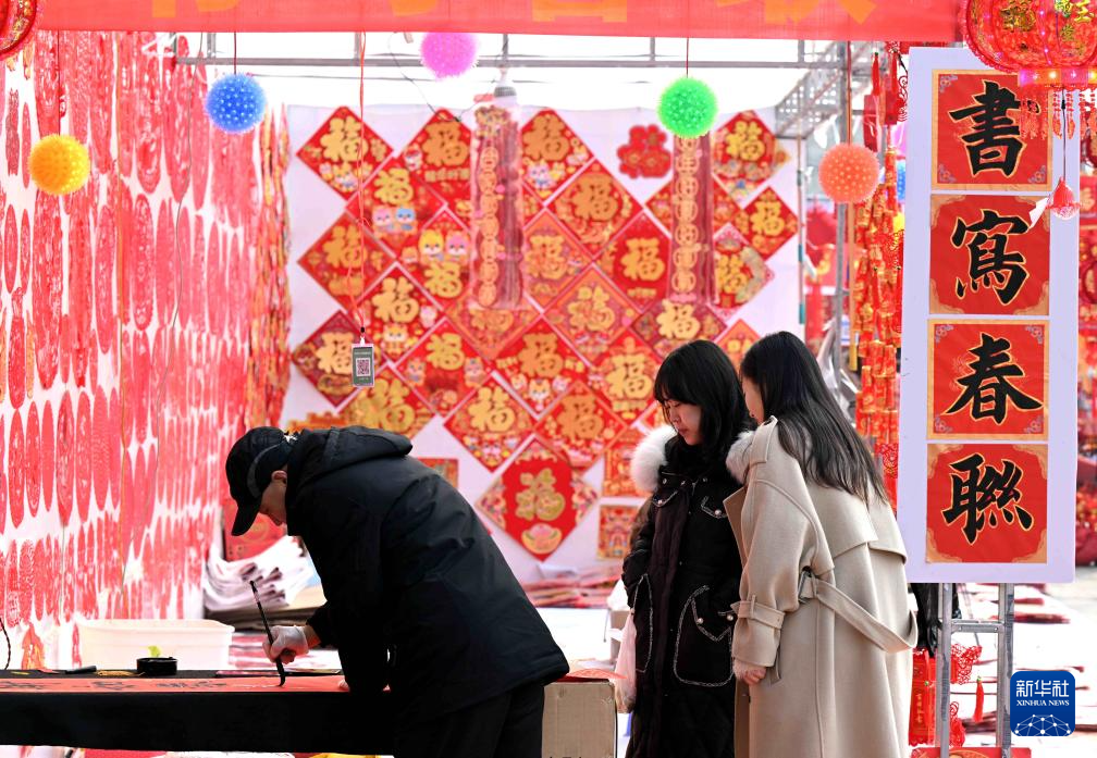 2月5日,在河北省石家庄市长安区一家年货市集,商家为市民现场写春联。