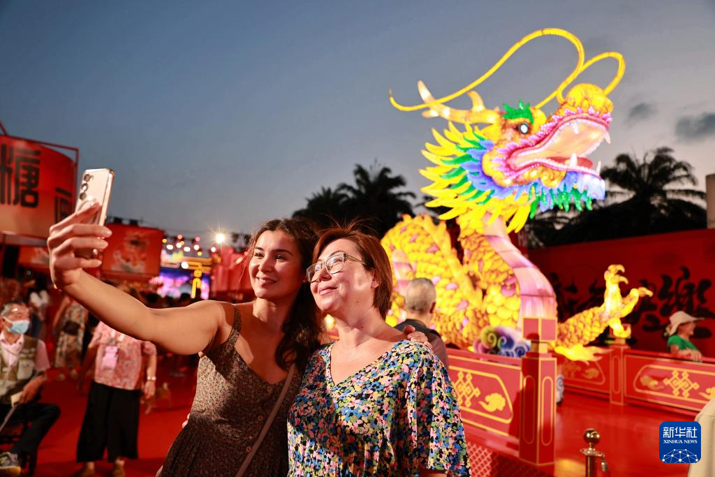 2月5日晚,在海南三亚大东海广场举行的新春游园会上,游客和10米巨龙花灯自拍留影。