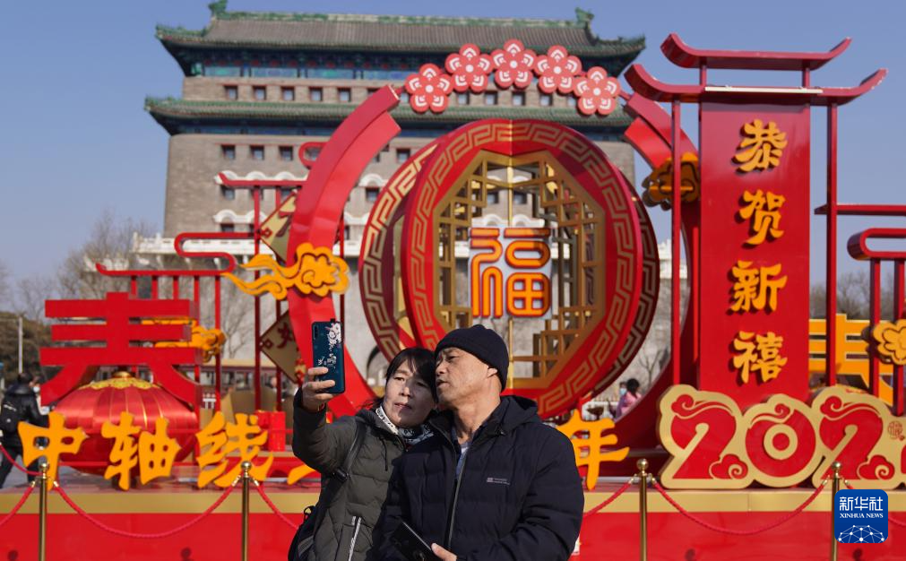 2月5日,游客在北京前门大街自拍留念。