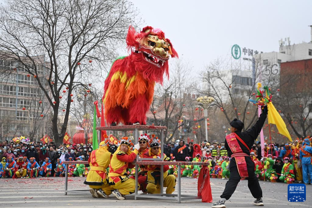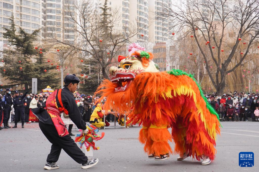 2月20日,在榆中县中心广场,红寺村社火队在表演舞狮。