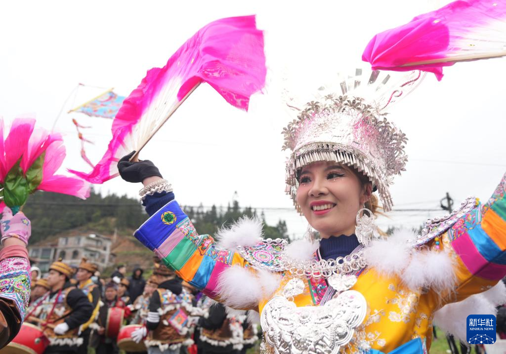 2月22日,芦笙队在广西柳州市融水苗族自治县安太乡举行的正月十三坡会上表演(无人机照片)。