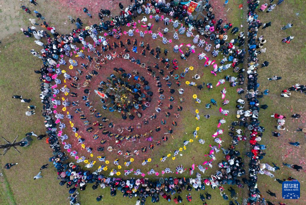 2月22日,村民在广西柳州市融水苗族自治县安太乡举行的正月十三坡会上表演(无人机照片)。