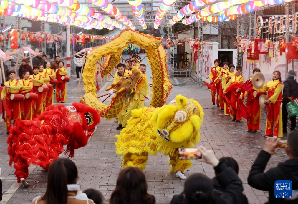 2月22日,在浙江省湖州市德清县阜溪街道三桥社区,人们在元宵灯会上欣赏舞龙、舞狮表演。