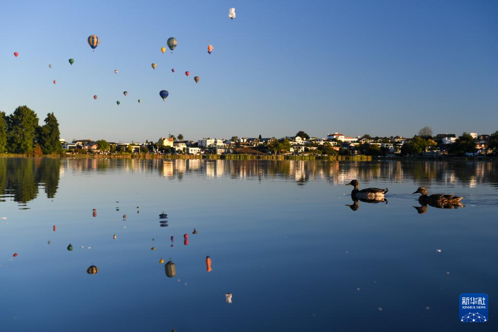 3月20日清晨,放飞的热气球经过新西兰汉密尔顿湖上空。