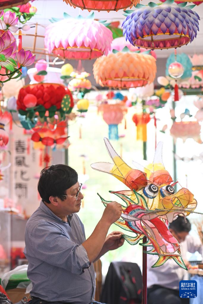 在小西湖街区的工作室,秦淮灯彩艺人、国家级非物质文化遗产代表性传承人顾业亮在龙灯上彩绘(4月1日摄)。
