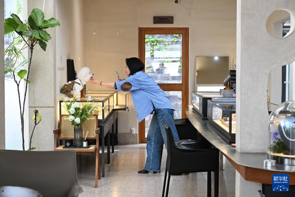 小西湖街区内的一家店铺的店主跟宠物互动(4月1日摄)。