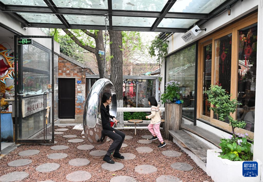 游客在小西湖街区一处“共享院”参观(4月1日摄)。