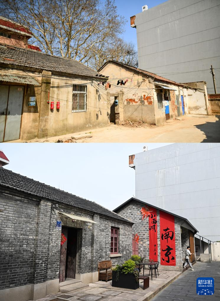 拼版照片:上图为小西湖街区堆草巷改造前的民居(资料照片);下图为改造后的小西湖街区堆草巷(4月1日摄,新华社记者 季春鹏 摄)。过去的民居已成为“共生院”。“共生院”是利用院落内居民搬迁的房屋释放部分空间,增加功能性设施,改善留住居民的生活居住条件,同时植入新业态,形成和谐共处的共生院落。