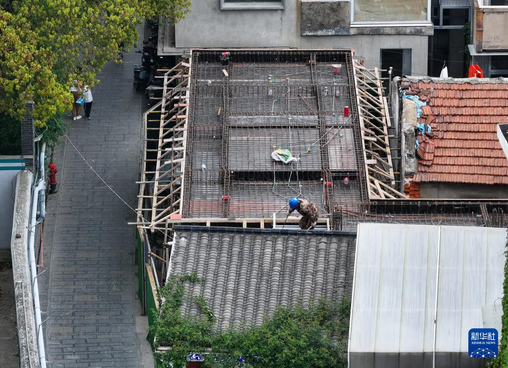 工人在对小西湖街区一处房屋进行改造(4月1日摄,无人机照片)。