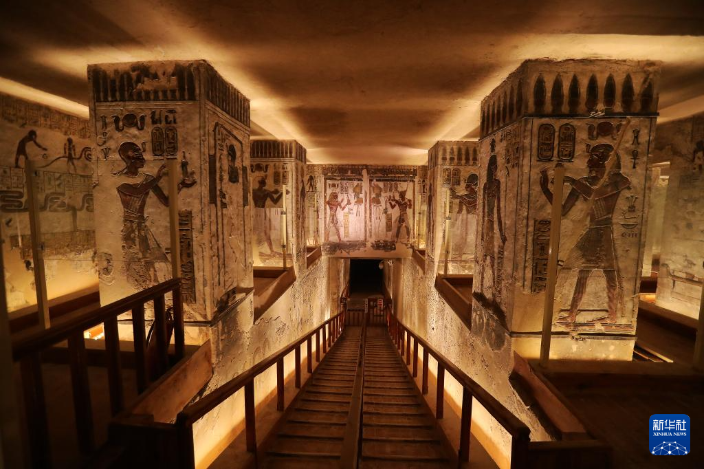 这是2023年1月24日在埃及卢克索王后谷拍摄的奈菲尔塔利地下陵墓壁画。