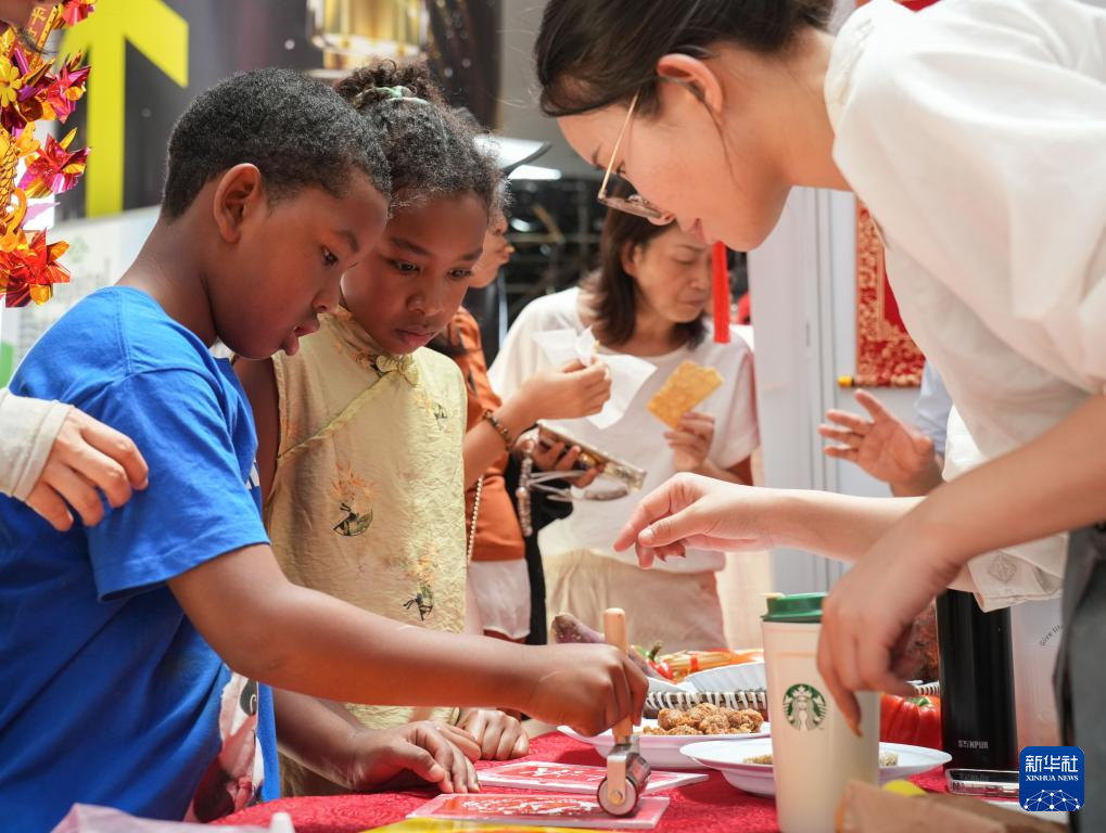 1月19日,孩子们在肯尼亚首都内罗毕举行的中国春节庙会活动上体验拓印技艺。