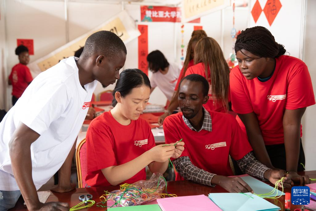 1月19日,在赞比亚首都卢萨卡举行的春节庙会活动上,赞比亚大学孔子学院的师生编制中国结。