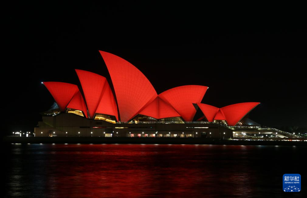 2月4日,澳大利亚悉尼歌剧院点亮“中国红”,庆祝中国农历新年。