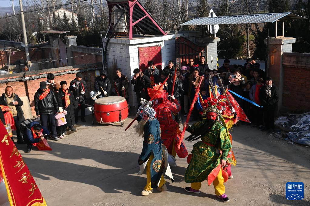 2月9日,陇县曹家湾镇流渠村社火队在陇县曹家湾镇三里营村村民家中进行游演。