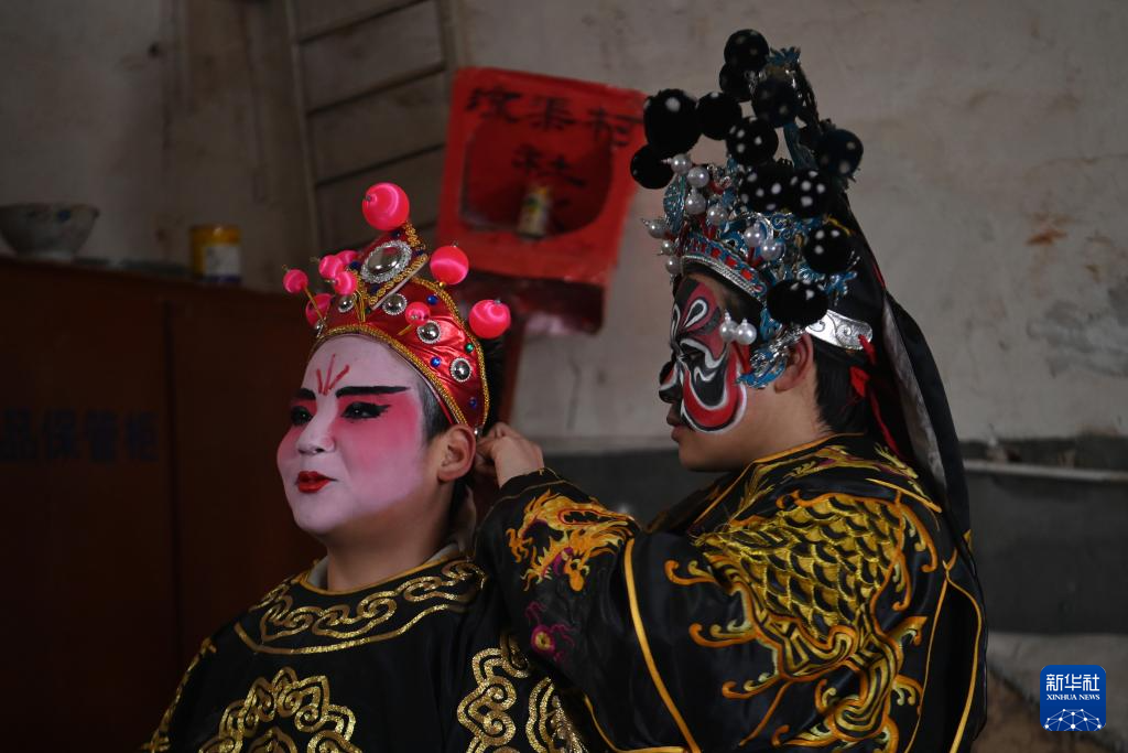 2月9日,陇县曹家湾镇流渠村社火队的孩子为同伴整理演出服装。