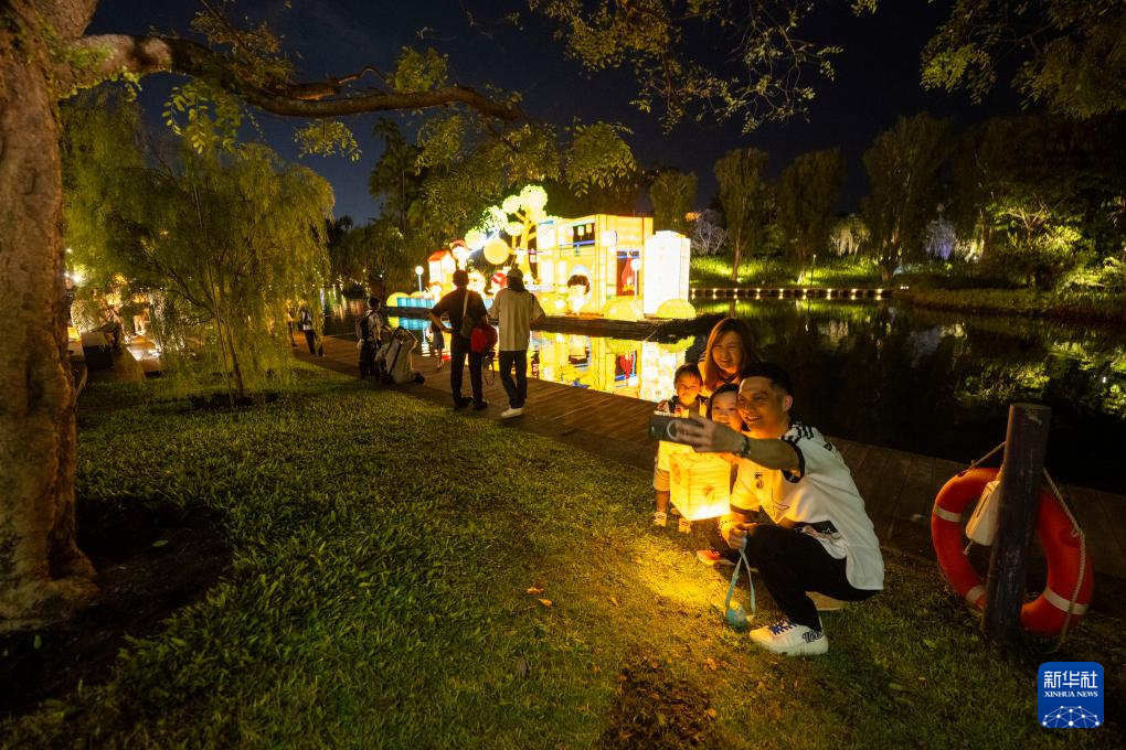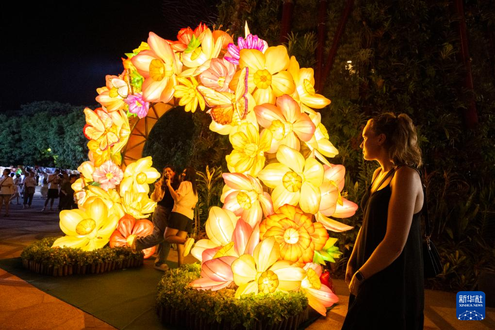 9月22日,游客在新加坡滨海湾花园欣赏中秋节灯饰。