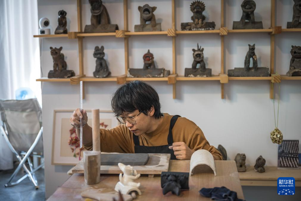 11月7日,张航在“心房瓦猫博物馆”内制作瓦猫。