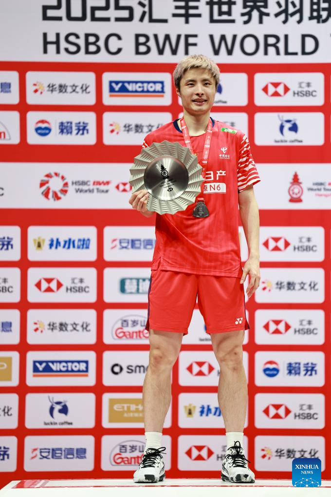 Runner-up Shi Yuqi poses during the awarding ceremony for the men's singles final between Shi Yuqi of China and Christo Popov of France at BWF World Tour Finals 2025 in Hangzhou, east China's Zhejiang Province, Dec. 21, 2025. (Xinhua/Jiang Han)