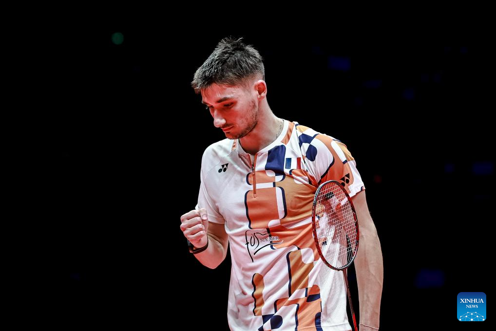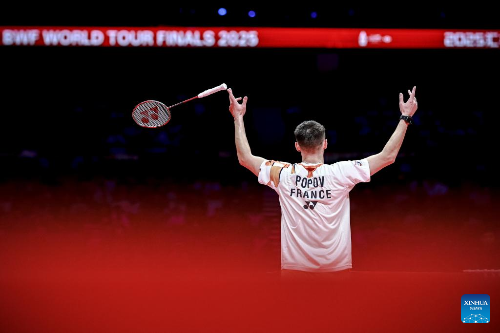 Christo Popov of France celebrates a score during the men's singles final against Shi Yuqi of China at BWF World Tour Finals 2025 in Hangzhou, east China's Zhejiang Province, Dec. 21, 2025. (Xinhua/Jiang Han)